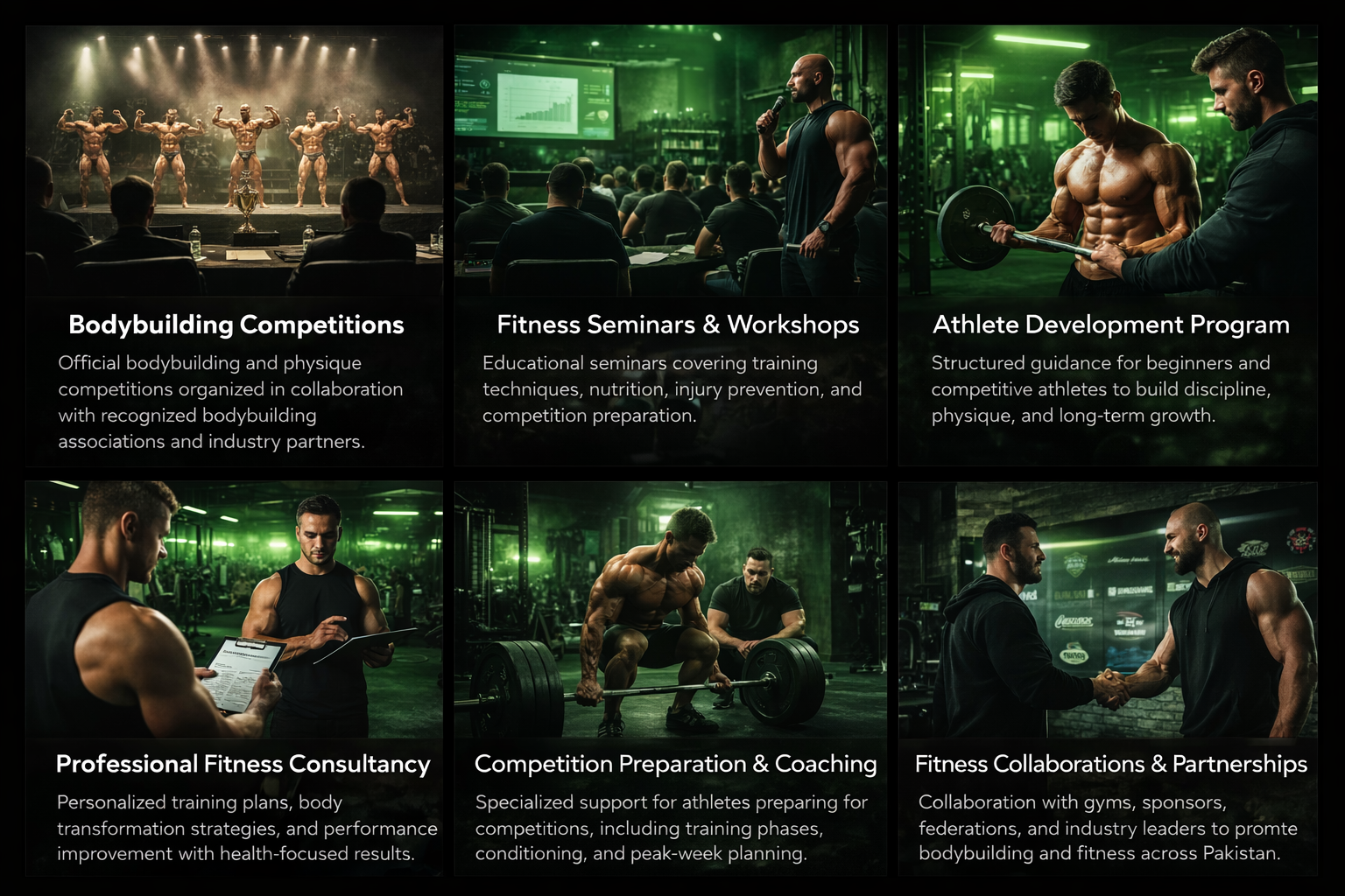 We are dedicated to promoting bodybuilding and fitness across Punjab and all over Pakistan through the organization of official bodybuilding competitions in collaboration with Sufi Group of Industries, along with fitness seminars and structured guidance programs for athletes and fitness enthusiasts.